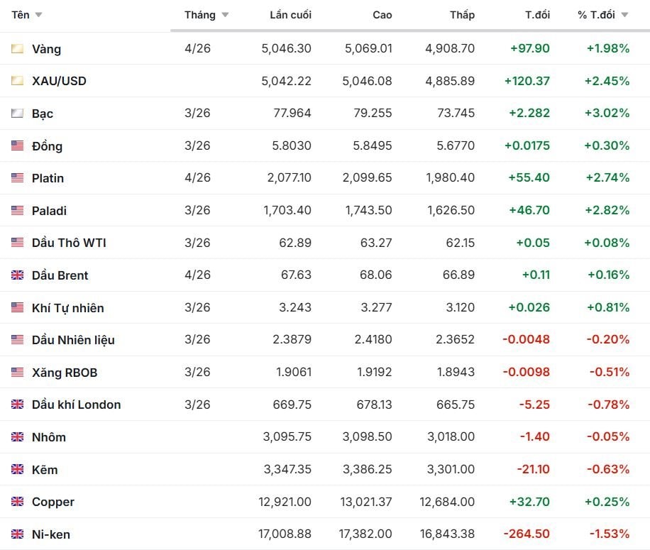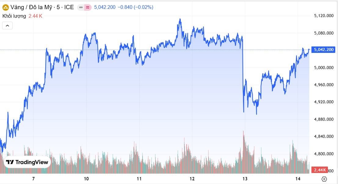 Giá vàng thế giới phục hồi mạnh sau dữ liệu lạm phát Mỹ yếu hơn dự kiến. Giá vàng giao ngay chốt phiên quanh 5.042 USD/ounce, tăng 149 USD/ounce so với phiên trước, khi thị trường kiểm tra lại ngưỡng kháng cự 5.000 USD/ounce. Vàng kỳ hạn 4/2026 đạt mức 5,046.30 USD/ounce, cao nhất 5,069.01 và thấp nhất 4,908.70, tăng 97.90 USD tương đương +1.98%.