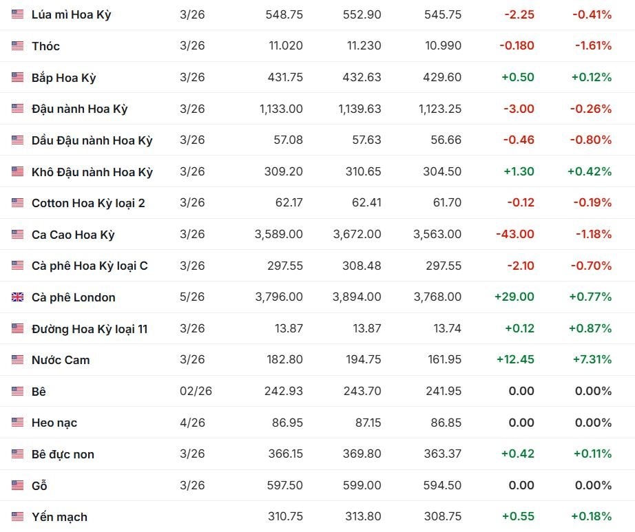 Ca cao Mỹ giảm mạnh -43.00 xuống 3,589.00 (-1.18%). Đường Mỹ loại 11 tăng +0.12 lên 13.87 (+0.87%). Nước cam tăng rất mạnh +12.45 lên 182.80 (+7.31%), là mức tăng phần trăm lớn nhất, đồng thời có biên độ ngày rộng từ 161.95 đến 194.75. Cotton Mỹ loại 2 giảm nhẹ -0.12 còn 62.17 (-0.19%). Gỗ xẻ không đổi ở 597.50. Yến mạch tăng +0.55 lên 310.75 (+0.18%).
