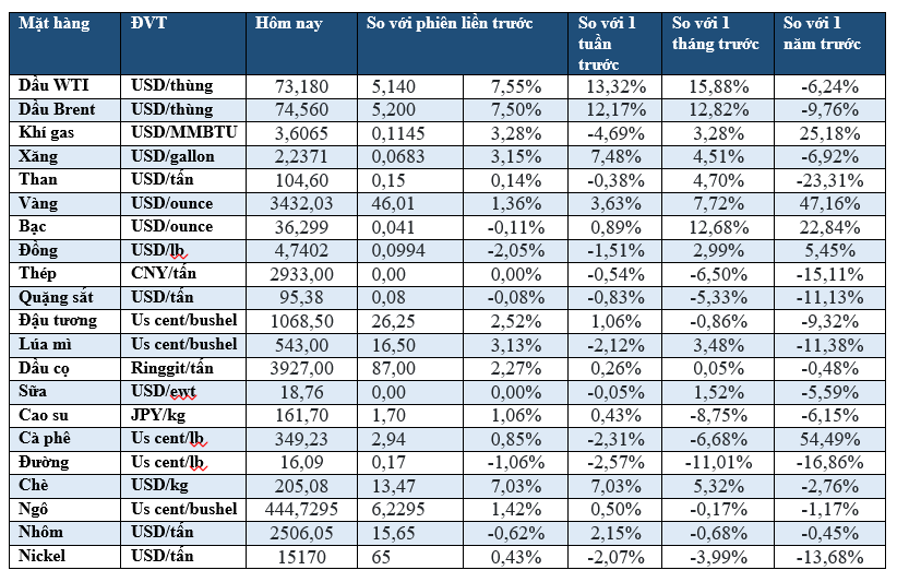 Giá dầu tăng mạnh 7% do lo ngại xung đột giữa Israel và Iran có thể làm gián đoạn nguồn cung từ Trung Đông. Dầu Brent chốt phiên ở mức 74,23 USD/thùng (tăng 7,02%), còn WTI đạt 72,98 USD/thùng (tăng 7,62%). Trong phiên, cả hai loại dầu từng tăng hơn 13–14%, mức cao nhất kể từ đầu năm.
