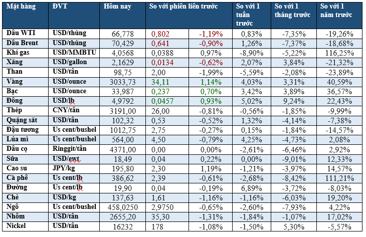 Chốt phiên giao dịch ngày 18/03/2025, giá dầu giảm 1% do đàm phán hòa bình Ukraine. Căng thẳng Trung Đông và lo ngại thuế quan thúc đẩy vàng lập kỷ lục mới. Giá đồng Mỹ lên đỉnh 10 tháng. Giá ca cao tăng do mùa vụ kém ở Bờ Biển Ngà. Giá ngũ cốc giảm nhẹ do cuộc điện đàm Mỹ-Nga và lo ngại về thuế quan.
