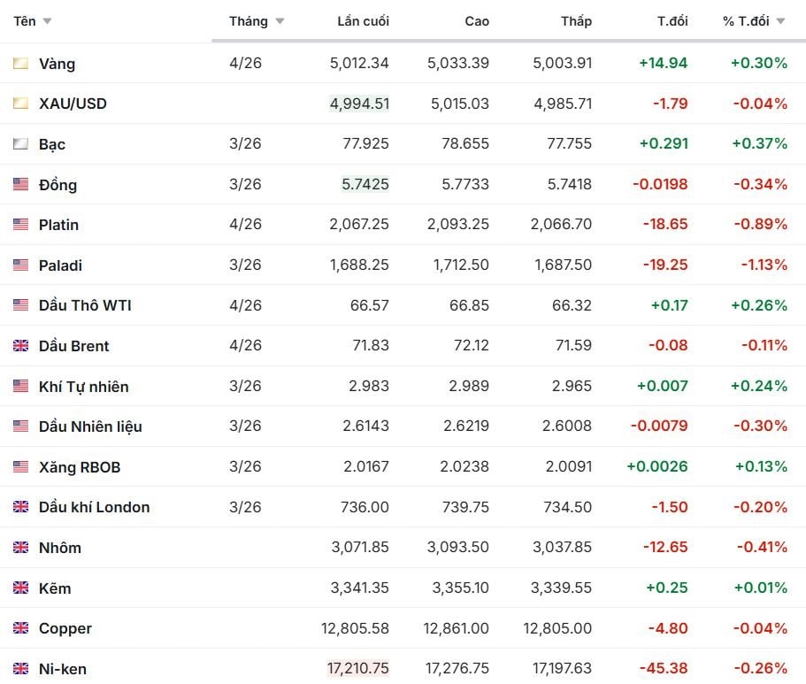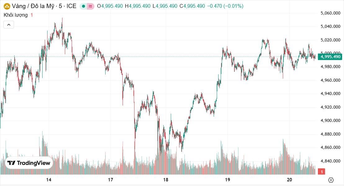 Thị trường kim loại quý biến động hẹp khi nhà đầu tư cân nhắc rủi ro địa chính trị và triển vọng lãi suất Mỹ. Giá vàng giao ngay chốt phiên gần như không đổi ở 4.979,18 USD/ounce, còn hợp đồng vàng tương lai tháng 4 giảm 0,2% xuống 4.997,40 USD/ounce. Sáng 20/2, giá vàng giao ngay tăng nhẹ 0,01% lên 4.995 USD/ounce, trong khi hợp đồng tháng 4 tăng 0,48% lên 5.020 USD/ounce.
