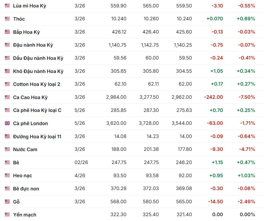 Trái ngược xu hướng giảm của nhiều nông sản, giá đậu nành kỳ hạn Chicago tăng phiên thứ ba liên tiếp và dao động quanh mức cao nhất ba tháng. Hợp đồng giao dịch sôi động nhất đạt 11,50 USD/bushel. Giá lúa mì tăng 1,5% lên 5,60 USD/bushel, còn ngô ổn định ở 4,27 USD/bushel.