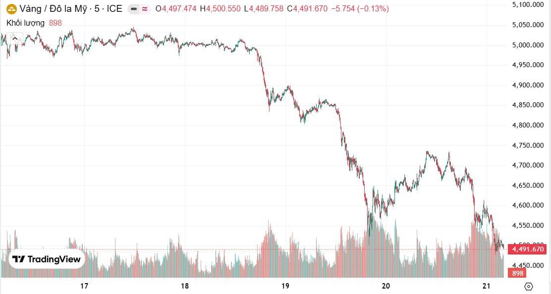 Ngày 21/3, giá vàng thế giới ghi nhận phiên giảm sâu khi chính thức thủng mốc 4.500 USD/ounce. Giá đóng cửa quanh 4.492–4.494 USD/ounce, mất tới hơn 240 USD so với đỉnh trong phiên và giảm mạnh so với phiên trước đó. Diễn biến này khiến thị trường vàng hướng tới tuần giảm gần 10% – mức giảm mạnh nhất trong khoảng 6 năm.