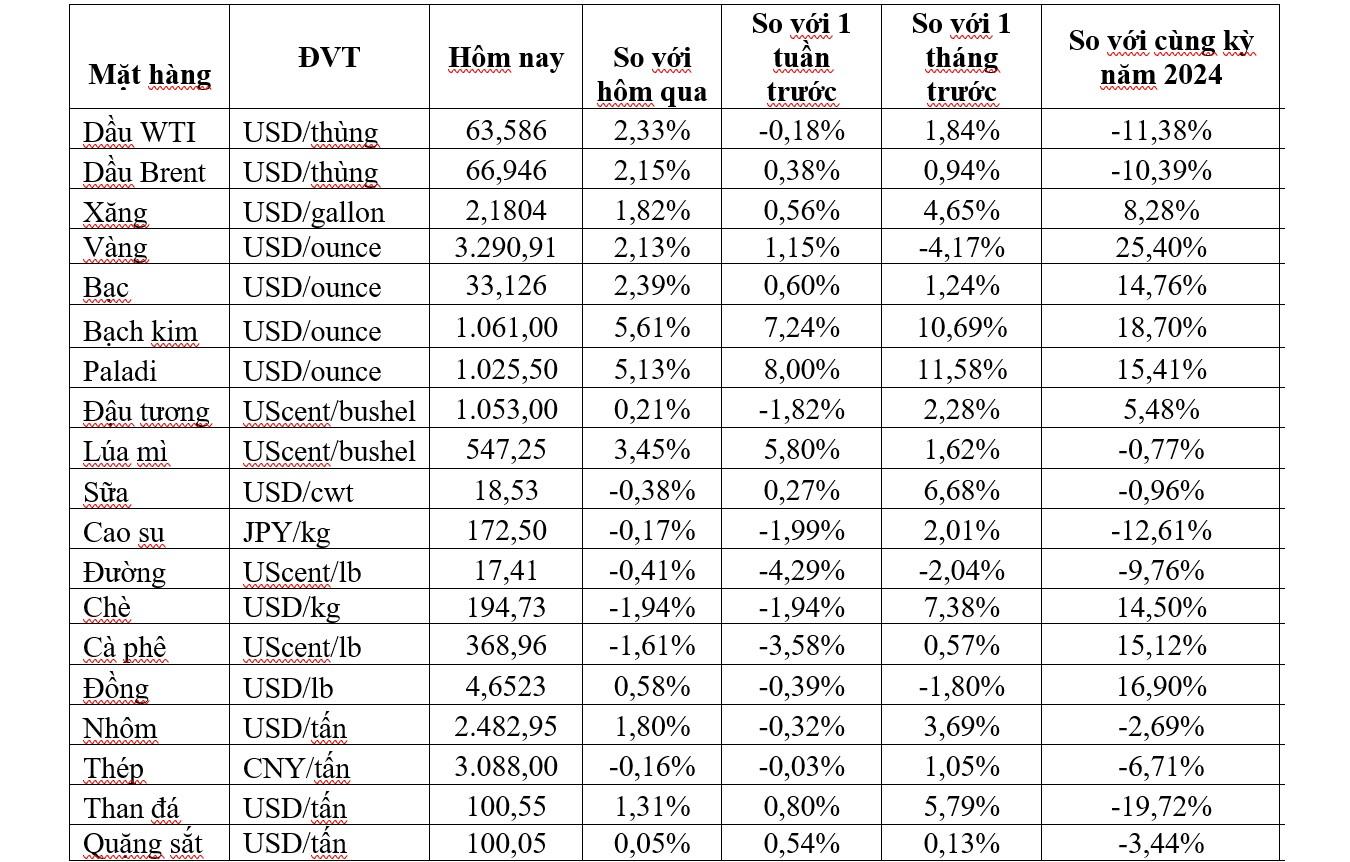 Vàng giao ngay trên sàn LBMA tăng 1,7% lên 3.284,74 USD/ounce. Vàng kỳ hạn tháng 6/2025 trên sàn New York tăng 1,6% lên 3.284,6 USD/ounce.