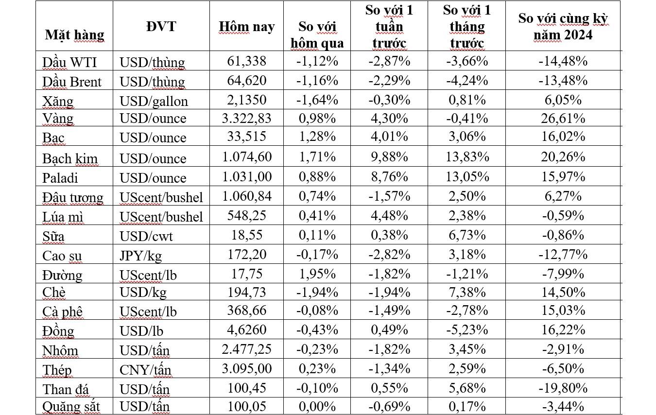 Trên sàn Chicago, giá lúa mì kỳ hạn tháng 7/2025 tăng 3-1/4 US cent lên 5,49-1/4 USD/bushel, trong phiên có lúc đạt 5,56-1/4 USD/bushel – cao nhất kể từ ngày 21/4/2025. Giá đậu tương kỳ hạn tháng 7/2025 tăng 9-3/4 US cent lên 10,62-3/4 USD/bushel và giá ngô giao cùng kỳ hạn tăng 6-1/2 US cent lên 4,61 USD/bushel.