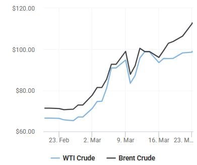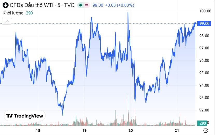 Tâm điểm thị trường là rủi ro gián đoạn nguồn cung năng lượng khi căng thẳng giữa Mỹ và Iran gia tăng, đặc biệt liên quan đến eo biển Hormuz - tuyến vận chuyển dầu quan trọng của thế giới. Giá dầu vì vậy biến động mạnh: dầu Brent giảm nhẹ 0,2% xuống 111,90 USD/thùng nhưng vẫn cao hơn 55% so với đầu tháng, trong khi dầu WTI giữ quanh 98,35 USD/thùng. Thực tế trong phiên sáng, dầu Brent giao dịch quanh 111,5-112 USD/thùng sau khi từng chạm 115 USD, còn WTI ở mức 97,89 USD/thùng.