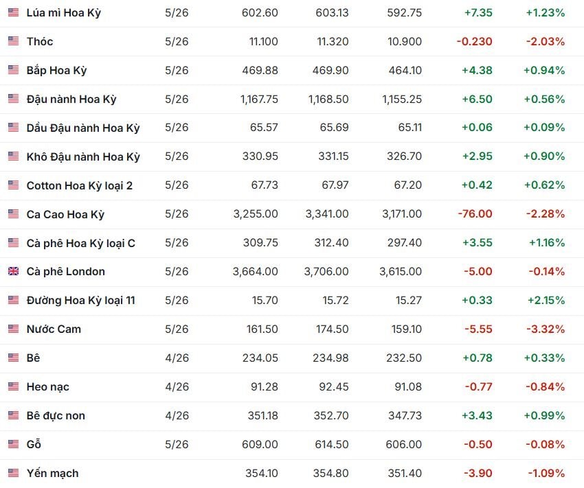 Thị trường cà phê diễn biến tích cực. Trên sàn London, giá Robusta kỳ hạn tháng 5/2026 đạt 3.664 USD/tấn, tăng 6%, còn hợp đồng tháng 7/2026 đạt 3.568 USD/tấn, tăng 5,8%. Trên sàn New York, Arabica tăng mạnh hơn, với kỳ hạn tháng 5/2026 đạt 309,75 US cent/pound (tăng 8,6%) và tháng 7/2026 đạt 302,35 US cent/pound (tăng 8%).