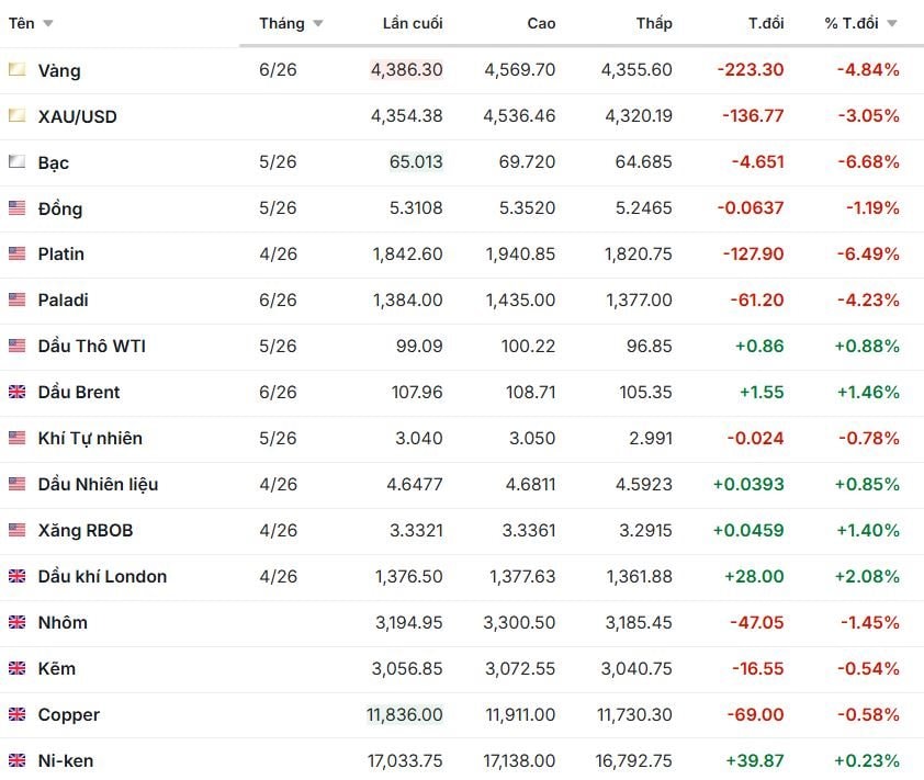Căng thẳng Trung Đông leo thang, kéo theo giá dầu duy trì trên 110 USD/thùng, vàng rơi khỏi mốc 4.500 USD/ounce và đồng USD tăng giá trở lại. Áp lực lạm phát gia tăng khiến lợi suất trái phiếu Mỹ lên đỉnh 8 tháng, trong khi nhiều mặt hàng như cà phê, thép và năng lượng chịu tác động lan tỏa từ cú sốc nguồn cung.