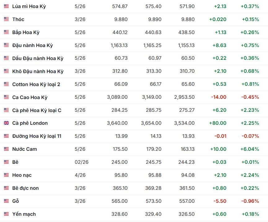Thị trường cà phê tăng trở lại khi giá Robusta trên sàn ICE London tăng 2,27%–3,42%, còn Arabica tăng 2,38%–2,68%. Ở kỳ hạn tháng 5/2026, Robusta tăng 80 USD lên 3.640 USD/tấn, Arabica tăng 160 USD lên 6.290 USD/tấn.