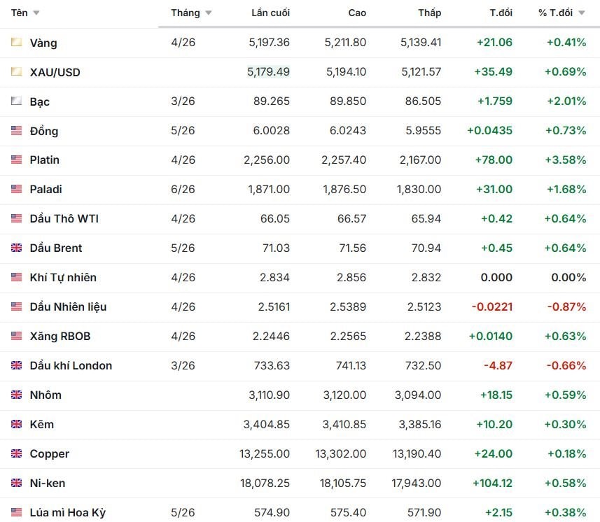 Ở nhóm kim loại cơ bản, nhôm (+0.59%), kẽm (+0.30%), copper (+0.18%) và niken (+0.58%) đều duy trì đà tăng nhưng biên độ khá khiêm tốn, cho thấy thị trường đang trong trạng thái hồi phục ổn định hơn là bứt phá mạnh.