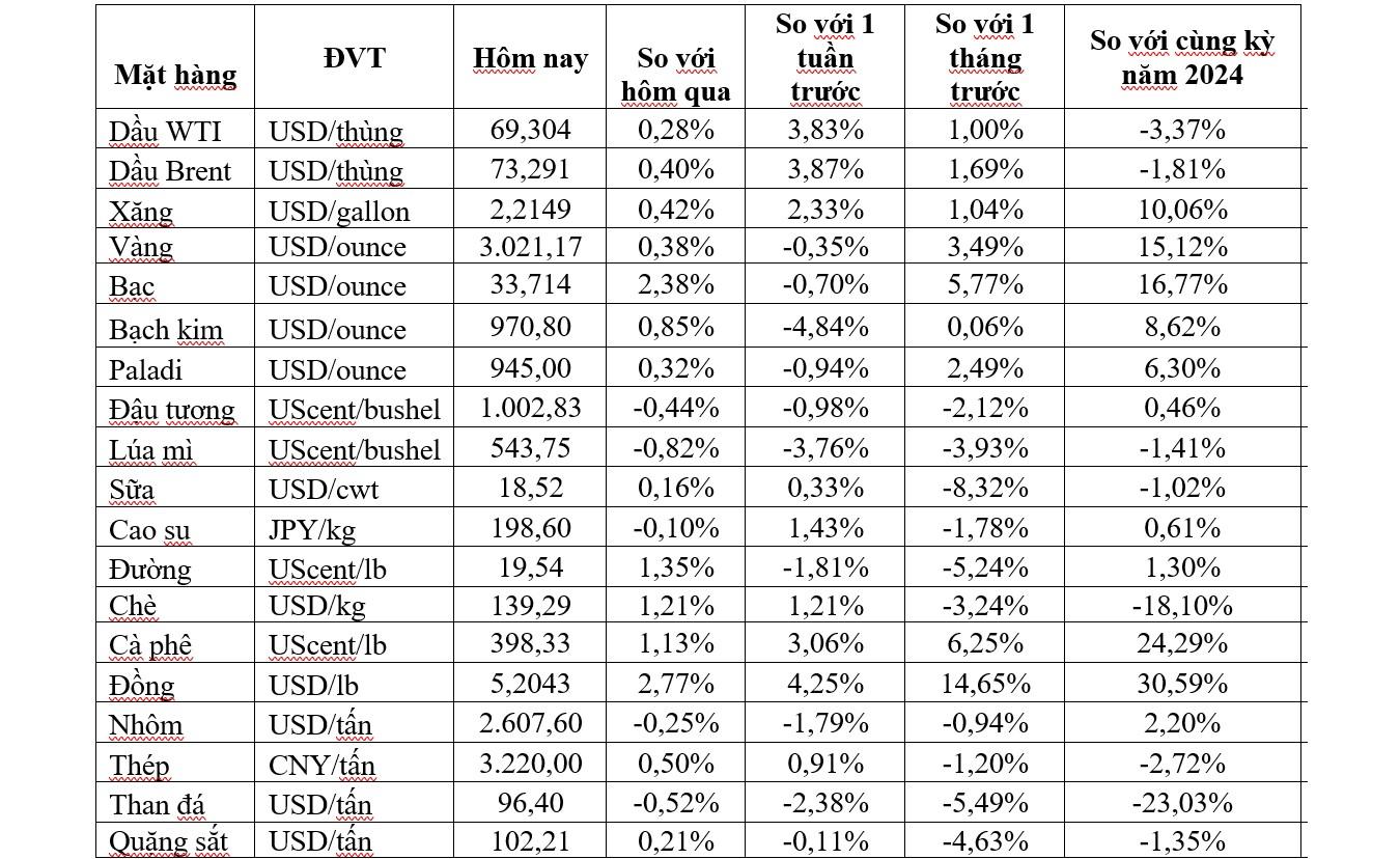 Chốt phiên giao dịch ngày 25/3, giá dầu diễn biến trái chiều, vàng, sắt thép, cao su, đường và cà phê... đồng loạt tăng, đồng cao nhất gần 6 tháng, trong khi khí tự nhiên thấp nhất 3 tuần và dầu cọ thấp nhất gần 2 tháng.