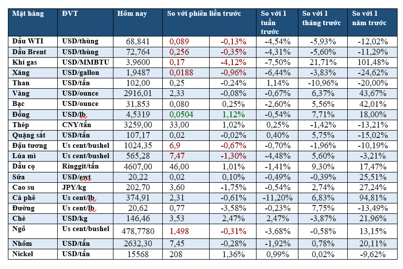 Chốt phiên, giá dầu Brent giảm 0,67% xuống 72,53 USD/thùng. Dầu thô WTI của Mỹ giảm 0,45% xuống 68,62 USD/thùng – mức thấp nhất kể từ ngày 10/12/2024.