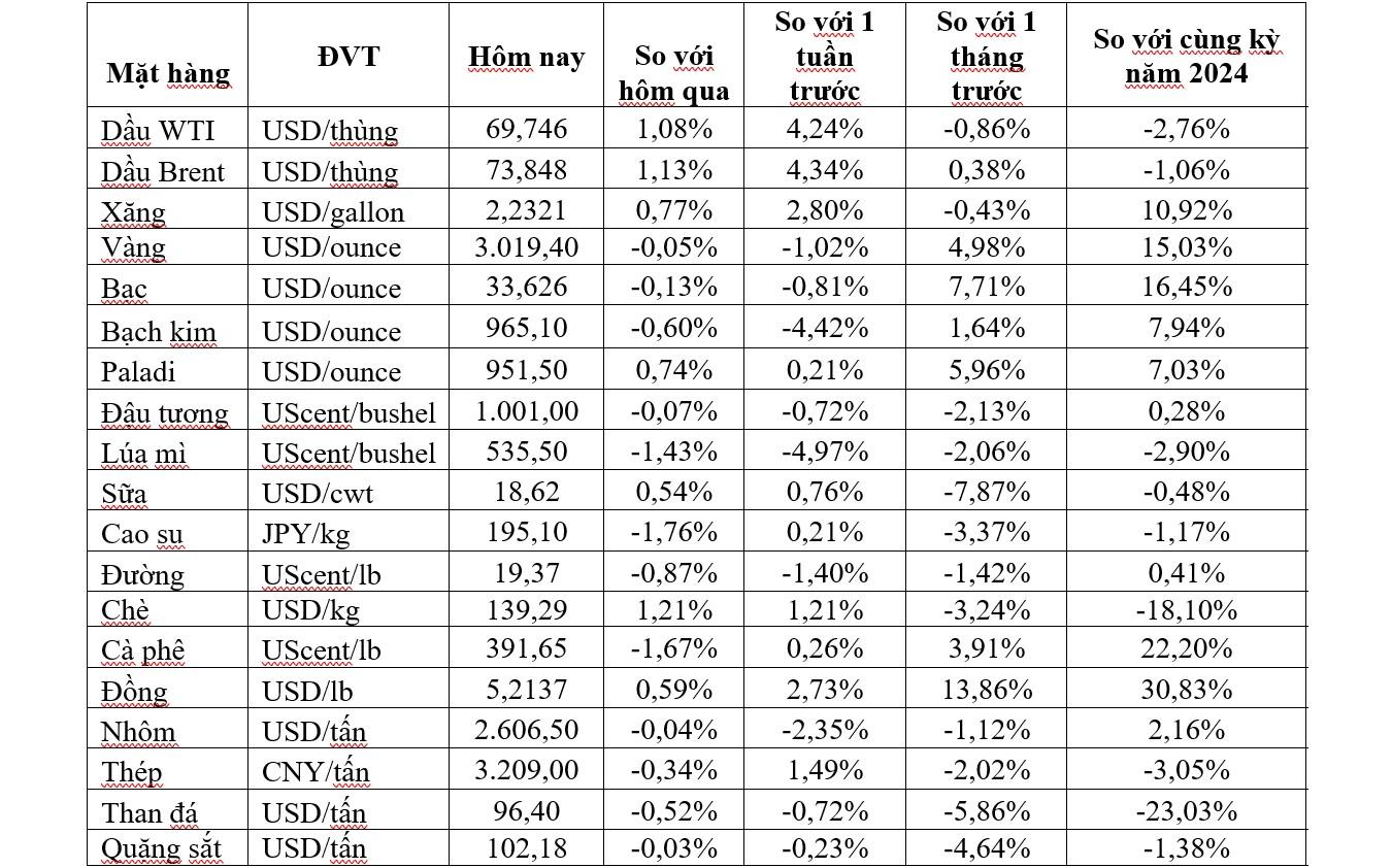 Vàng giao ngay trên sàn LBMA giảm 0,1% xuống 3.016,71 USD/ounce. Vàng kỳ hạn tháng 4/2025 trên sàn New York giảm 0,1% xuống 3.022,5 USD/ounce.