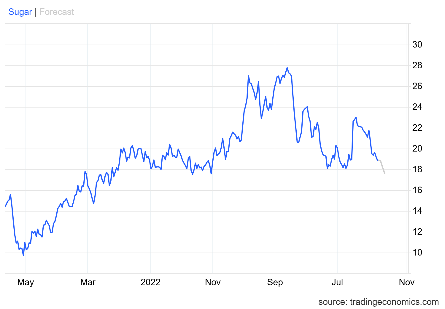 Các nhà phân tích cho rằng, hiện tại, thiếu nhu cầu ngay lập tức và tình hình cung vượt cầu đã khiến giá giảm. Giá đường trắng (SF1!) cũng giảm 1,4%, xuống còn 496,40 USD/tấn sau khi giảm xuống mức thấp nhất là 492,70 USD/tấn, mức yếu nhất trong gần hai năm.