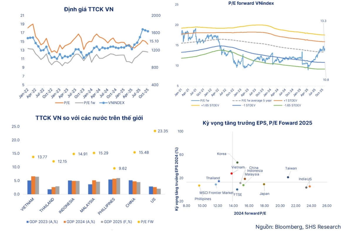 Tính đến cuối tháng 10/2025, tổng vốn hóa toàn thị trường khoảng 368 tỷ USD, tương đương 77% GDP năm 2024, được xem là mức tương đối hợp lý nếu xét đến triển vọng tăng trưởng và quy mô GDP năm 2026. Định giá P/E của VN- ở mức 14,4, P/E Forward 12,6, tương đối hợp lý nếu xét triển vọng tăng trưởng.