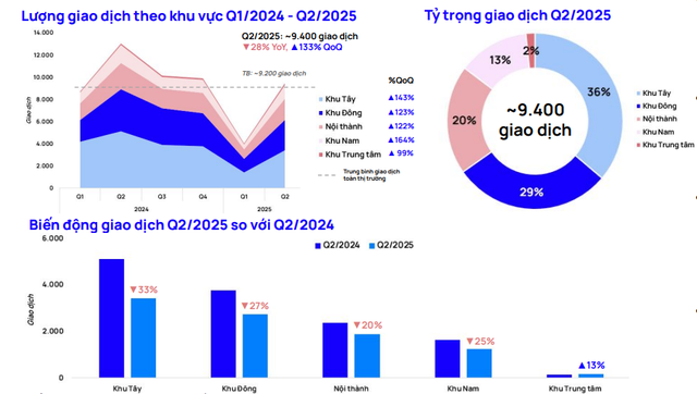 Trong đó, khu Tây dẫn đầu thị trường với 3.600 giao dịch (tăng 143% so với quý trước, giảm 33% so với cùng kỳ năm trước), chiếm 36% thị phần. Khu vực này hưởng lợi từ nhu cầu ở thực cao, mật độ dân cư lớn, hạ tầng đồng bộ và gần các cụm văn phòng lớn tại Hà Nội.