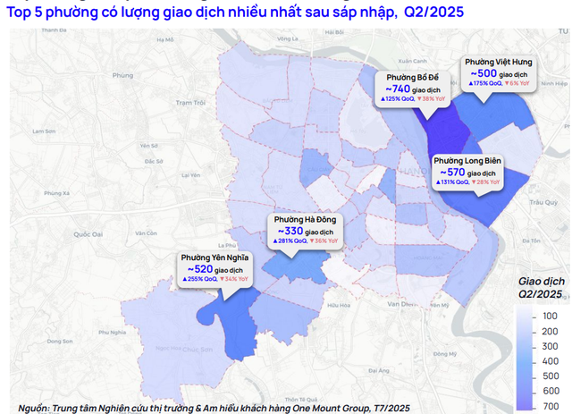 Các phường giao dịch nhiều nhất tập trung tại quận Long Biên và Hà Đông (cũ) quý 2/2025, top 5 phường ghi nhận lượng giao dịch nhiều nhất gồm 3 phường tại quận Long Biên cũ: P. Bồ Đề, P. Long Biên, P. Việt Hưng và 2 phường tại quận Hà Đông cũ: P. Yên Nghĩa và P. Hà Đông.