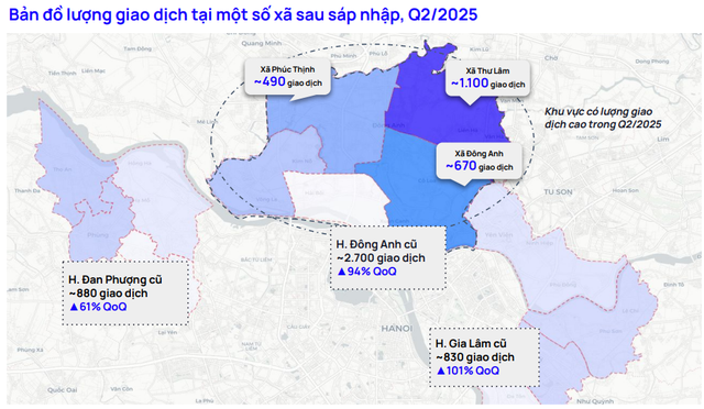 Tại khu vực huyện Đông Anh cũ, xã Thư Lâm có lượng giao dịch lớn nhất (~1.100 căn) do sự hiện diện của các khu công nghiệp và làng nghề truyền thống, tạo ra nhu cầu nhà ở, kinh doanh phụ trợ. Đông Anh ghi nhận 670 giao dịch do đây là khu vực ôm trọn phần lớn KĐT Vinhomes Cổ Loa, định vị là "thành phố thương mại quốc tế".