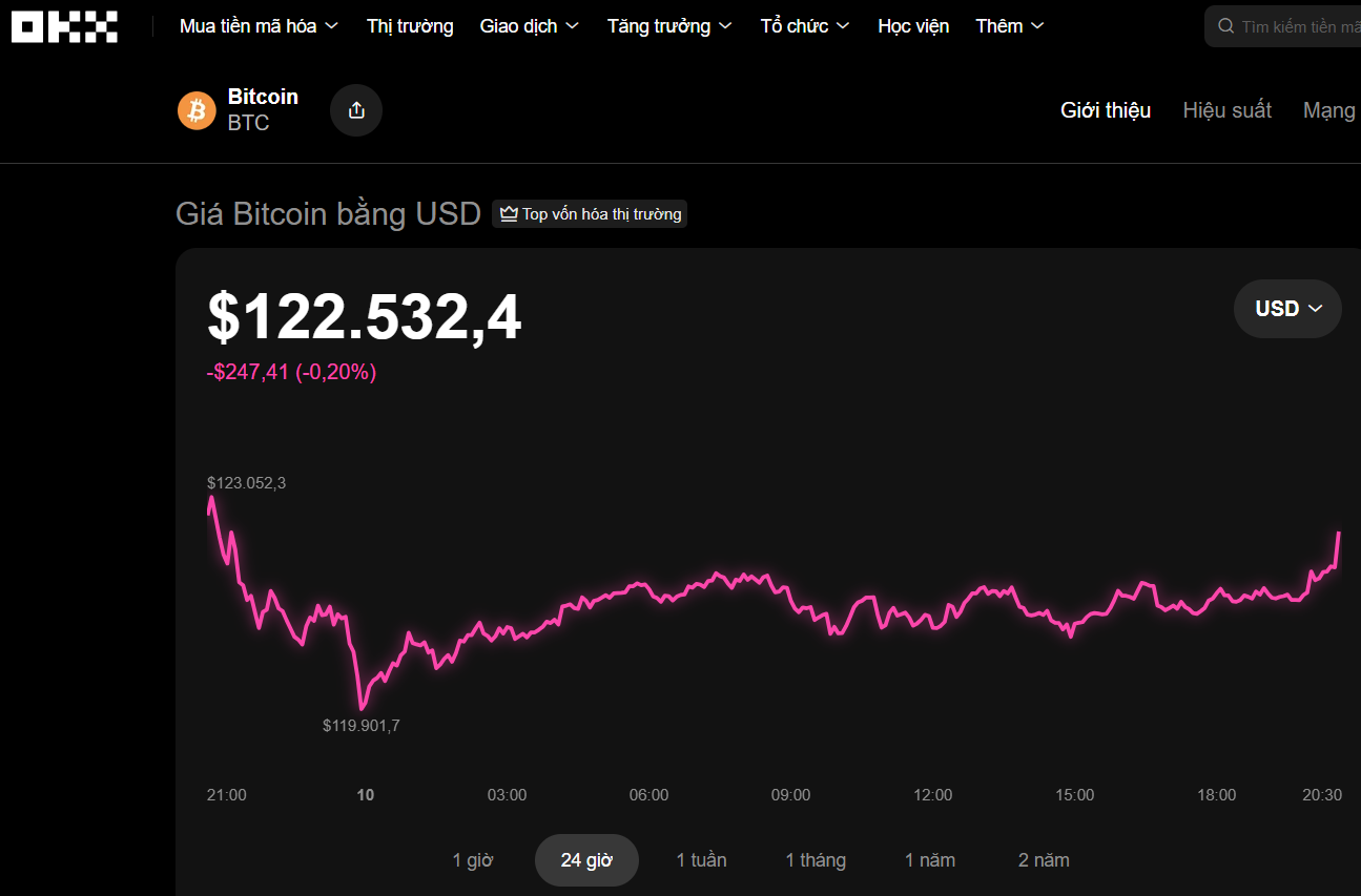 Bitcoin đang giao dịch ở vùng 122.500 USD Nguồn: OKX