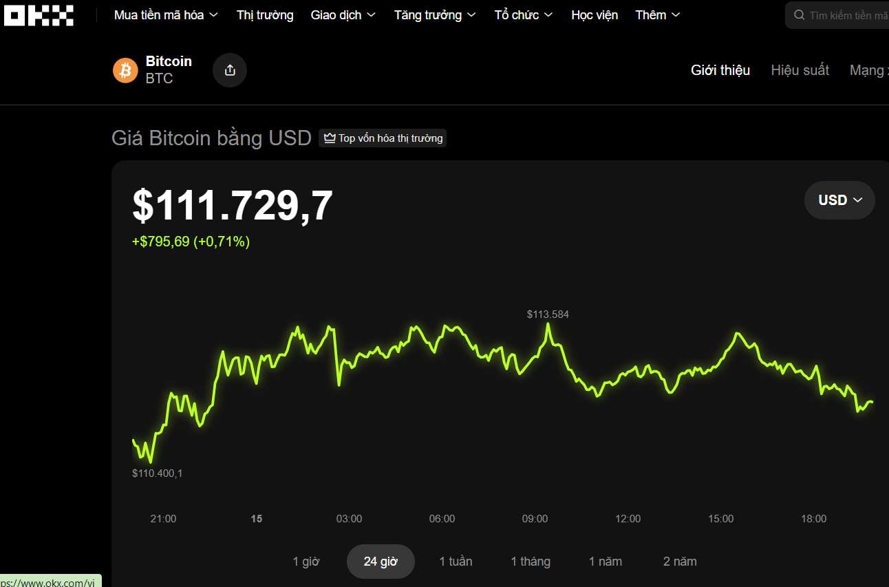 Tối 15-10, thị trường tiền số khởi sắc trở lại. Dữ liệu từ sàn giao dịch OKX cho thấy trong 24 giờ qua, giá Bitcoin (BTC) tăng hơn 0,7%, lên 111.700 USD, đánh dấu sự phục hồi nhẹ sau giai đoạn điều chỉnh.