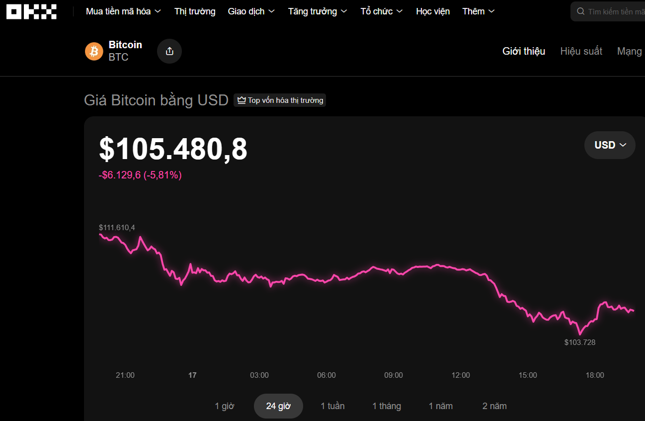 Tối 17-10, thị trường tiền số lao dốc mạnh. Dữ liệu từ sàn OKX cho thấy trong 24 giờ qua, giá Bitcoin (BTC) giảm hơn 5%, còn khoảng 105.480 USD.