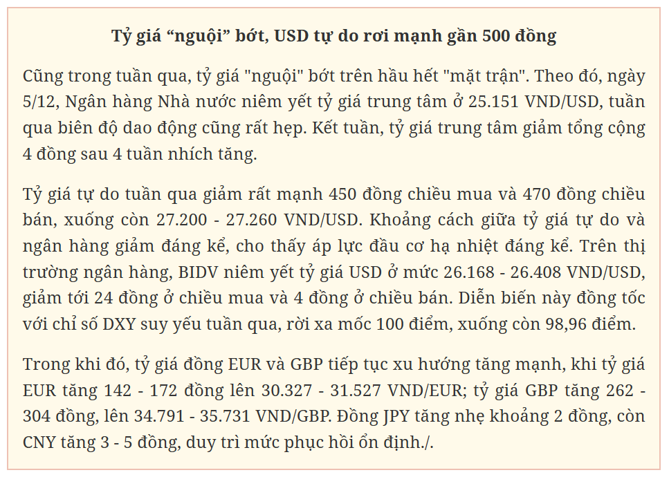 Diễn biến thị trường tiền tệ tuần qua từ ngày 1 - 5/12 cho thấy, lãi suất liên ngân hàng nhiều kỳ hạn tiến sát 7,5%, phản ánh áp lực thanh khoản ngắn hạn, dấu hiệu thị trường thiếu “oxy”. Tiếp đà bơm ròng 35.317,15 tỷ đồng, Ngân hàng Nhà nước có hàng loạt động thái mới khi nâng lãi suất OMO lên 4,5%; triển khai công cụ hoán đổi ngoại tệ kỳ hạn 14 ngày nhằm hỗ trợ thanh khoản hệ thống giai đoạn cao điểm, khi "mặt trận" tỷ giá nguội bớt.