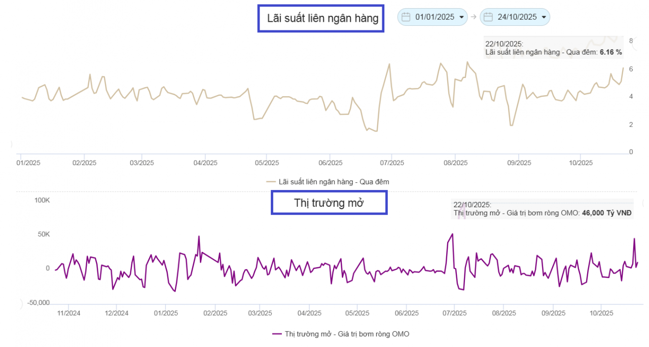 Thị trường tiền tệ tuần qua từ ngày 20 - 24/10 tiếp tục ghi nhận biến động trái chiều. Trong khi tỷ giá trung tâm và ngân hàng giảm nhẹ, thị trường tự do vọt lên 27.700 VND/USD, kéo dài chuỗi tăng 5 tuần. Ngân hàng Nhà nước bán 1,5 tỷ USD kỳ hạn để ổn định tỷ giá, song bơm ròng 72.852 tỷ đồng hỗ trợ thanh khoản khi lãi suất liên ngân hàng quanh 6%.