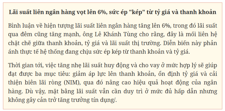 Tuần qua, lãi suất liên ngân hàng tiếp tục duy trì ở mức cao, phản ánh áp lực thanh khoản gia tăng trong hệ thống. Cụ thể, lãi suất qua đêm tăng từ 4,97% đầu tuần lên 5,81% cuối tuần, tăng 0,45% so với cuối tuần trước, đánh dấu tuần thứ 2 liên tiếp neo quanh vùng 6%. Các kỳ hạn 1 tuần và 2 tuần cũng biến động tương tự, lần lượt tăng lên 5,86% và 5,95%, tương ứng tăng 0,37% và 0,42%. Trong khi đó, kỳ hạn 1 tháng giảm nhẹ 0,24% xuống 5,37%.