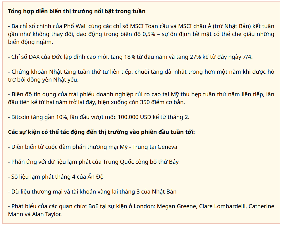 Thị trường tài chính toàn cầu duy trì đà ổn định trong tuần qua, trong bối cảnh chính quyền Tổng thống Donald Trump đạt được thỏa thuận thương mại đầu tiên, được kỳ vọng là mở đầu cho hàng loạt thỏa thuận khác trong thời gian tới. Tâm lý nhà đầu tư cũng được cải thiện đáng kể trước thềm cuộc đàm phán thương mại Mỹ - Trung diễn ra cuối tuần tại Thụy Sĩ.