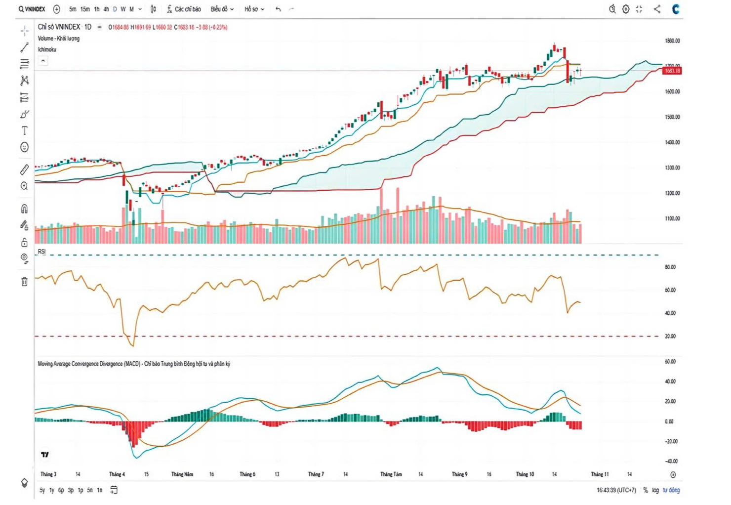 Trong tuần giao dịch tuần 27–31/10, VN-Index được các chuyên gia BVSC Research dự báo sẽ tiếp tục dao động trong biên độ rộng khoảng 30 điểm. Chỉ số nhiều khả năng sẽ hướng lên thử thách vùng kháng cự 1.700–1.710 điểm. Tín hiệu cuối tuần trước với cây nến đỏ có bóng dưới dài cho thấy lực cầu đã xuất hiện quanh ngưỡng 1.660 điểm, song áp lực bán tại khu vực Tenkan – Kijun vẫn còn đáng kể và sẽ là trở ngại cho xu hướng hồi phục.