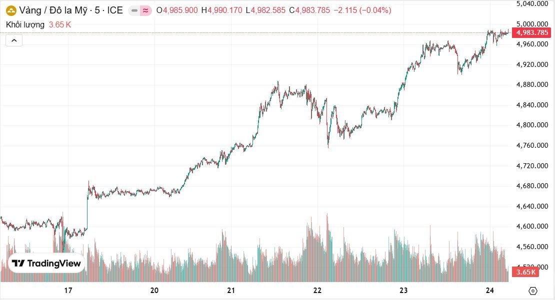 Thị trường kim loại quý trở thành tâm điểm của tuần khi giá vàng và bạc liên tục xô đổ các kỷ lục lịch sử, phản ánh tâm lý trú ẩn mạnh mẽ của dòng vốn toàn cầu trước bất ổn địa chính trị và sự suy yếu của đồng USD. Trong phiên 23/1, giá vàng giao ngay đạt mức cao kỷ lục 4.988 USD/ounce, tiến sát mốc tâm lý 5.000 USD/ounce, trong khi giá bạc lần đầu tiên trong lịch sử vượt ngưỡng 100 USD/ounce và lên tới 101–103 USD/ounce.