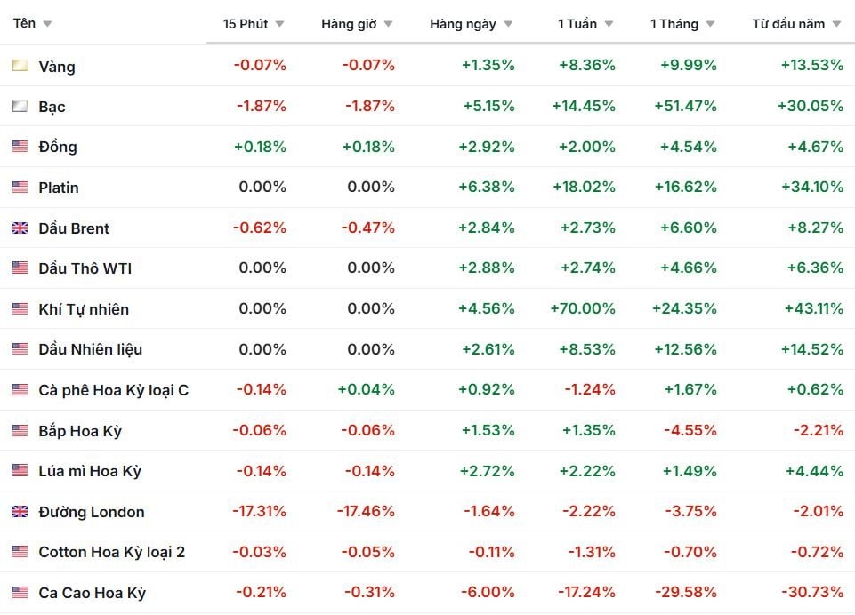 Đáng chú ý nhất là đường London và ca cao, khi cả hai đều giảm sâu. Đường London mất 2,22% trong tuần và 2,01% từ đầu năm, cho thấy xu hướng suy yếu kéo dài. Ca cao giảm tới 17,24% trong tuần và 30,73% từ đầu năm, trở thành mặt hàng giảm mạnh nhất trong tuần, phản ánh sự điều chỉnh mạnh sau giai đoạn tăng nóng trước đó.
