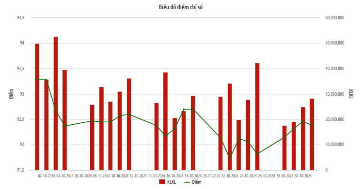 Theo thông tin từ Sở Giao dịch Chứng khoán Hà Nội (HNX) chỉ số UPCoM Index đóng cửa tháng 10/2024 đạt 92,38 điểm (giảm 1,26%), trong khi đó thanh khoản trên thị trường UPCoM có xu hướng tăng nhẹ với khối lượng giao dịch tăng 6,52% và giá trị giao dịch bình quân đạt tăng 11,38%.