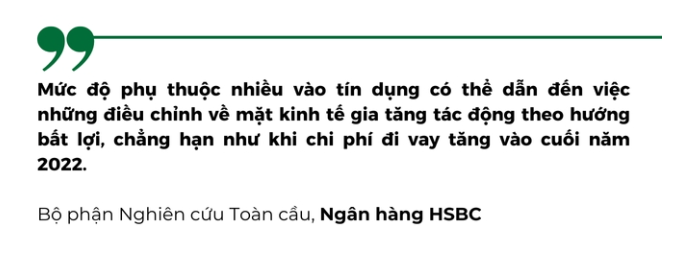 “Mức độ phụ thuộc nhiều vào tín dụng có thể dẫn đến việc những điều chỉnh về mặt kinh tế gia tăng tác động theo hướng bất lợi, chẳng hạn như khi chi phí đi vay tăng vào cuối năm 2022. Khi nền kinh tế trải qua một đợt lạm phát ngay sau đại dịch và Ngân hàng Nhà nước Việt Nam ứng phó bằng cách thắt chặt chính sách tiền tệ, tăng trưởng tín dụng đã giảm mạnh khi áp lực len lỏi vào nhiều lĩnh vực kinh tế trong nước, đặc biệt là ngân hàng và bất động sản, thuộc nhóm các dịch vụ khác”, HSBC nhận định.
