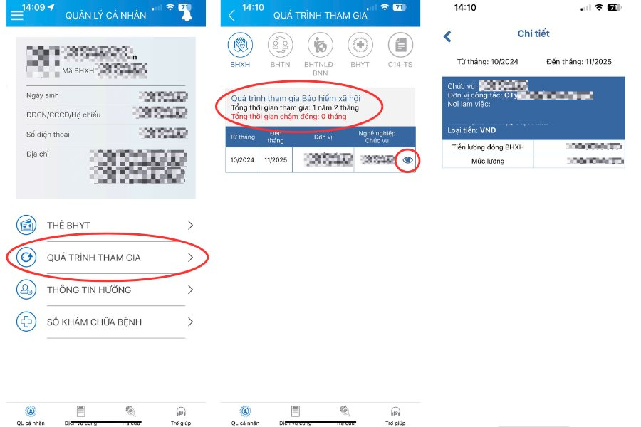Ngoài ra, để xem chi tiết về việc đóng bảo hiểm, người dùng có thể chọn biểu tượng hình con mắt để xem thêm các thông tin.