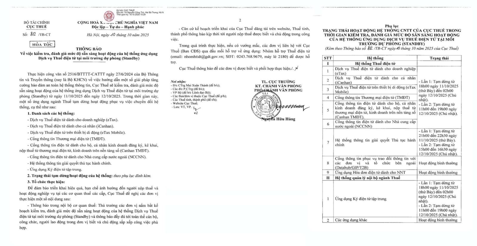 Ngày 10/10, Cục Thuế (Bộ Tài chính) phát đi 2 thông báo liên tiếp về kế hoạch tạm dừng các hệ thống ứng dụng ngành thuế phục vụ kiểm tra, đánh giá mức độ sẵn sàng của hệ thống ứng dụng dịch vụ thuế điện tử tại môi trường dự phòng (Standby).