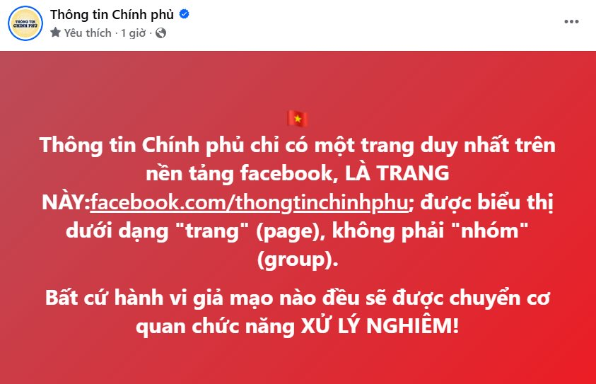 "Thông tin Chính phủ chỉ có một trang duy nhất trên nền tảng Facebook, LÀ TRANG NÀY: facebook.com/thongtinchinhphu; được biểu thị dưới dạng "trang" (page), không phải "nhóm" (group). Bất cứ hành vi giả mạo nào đều sẽ được chuyển cơ quan chức năng XỬ LÝ NGHIÊM!"