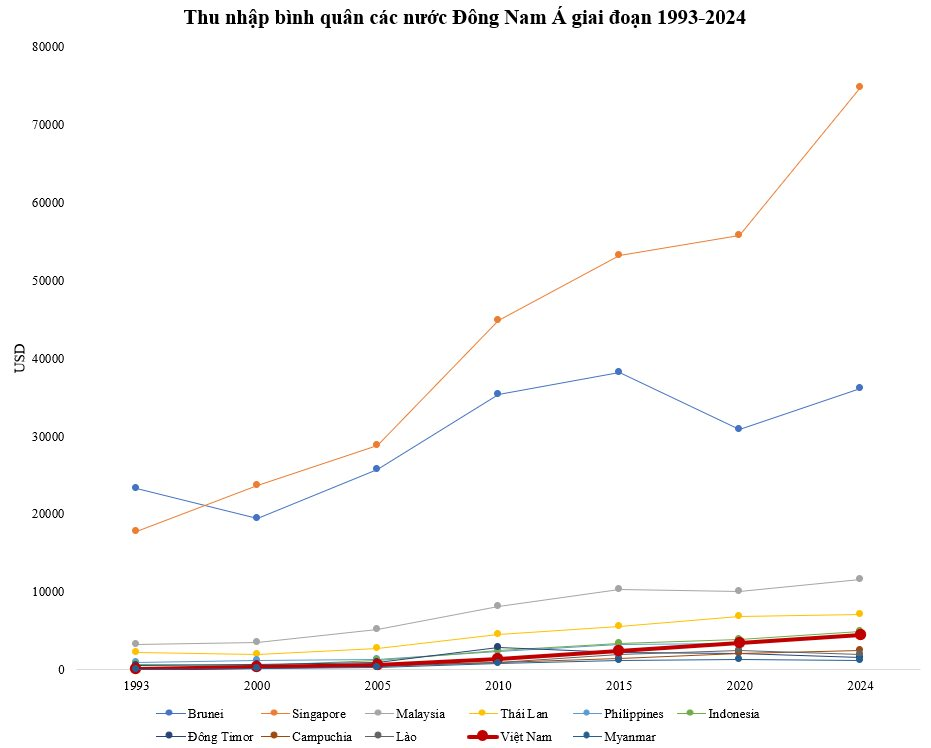 Xét trong toàn bộ các nước trong khu vực Đông Nam Á, thu nhập bình quân của Việt Nam có sự thay đổi rõ rệt trong giai đoạn 1993 - 2024.