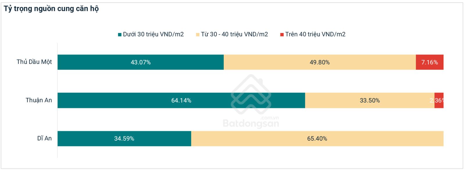 Theo dữ liệu Toàn cảnh thị trường chung cư Bình Dương 2024 của Batdongsan.com.vn, tính đến quý 4/2024, tỷ lệ căn hộ cao cấp và hạng sang ở Hà Nội và TP.HCM lần lượt là 74% và 41%. Trong khi đó, nguồn cung căn hộ phân khúc này tại Bình Dương cực kỳ khan hiếm. Số lượng căn hộ trên 40 triệu đồng/m2 chỉ chiếm 7,16% tại Thủ Dầu Một, 2,36% tại Thuận An và hoàn toàn vắng bóng ở Dĩ An.
