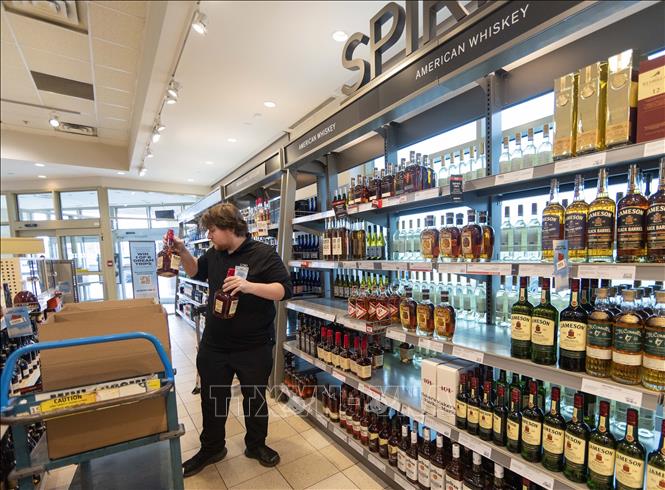Nhân viên thu hồi những chai rượu sản xuất tại Mỹ trên kệ hàng trong siêu thị ở Oakville, Ontario, Canada. Ảnh: THX/TTXVN