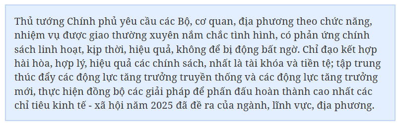 Để hoàn thành được các mục tiêu đề ra, Thủ tướng yêu cầu các bộ, ngành, cơ quan, địa phương quyết tâm cao, nỗ lực lớn, hành động quyết liệt, hiệu quả, có trọng tâm, trọng điểm, làm việc nào dứt việc đó, bản lĩnh, bình tĩnh, xem xét các vấn đề một cách khoa học, khách quan, bám sát thực tiễn; phối hợp nhịp nhàng, chặt chẽ, hiệu quả giữa các chính sách, giữa các Bộ, ngành, giữa Trung ương và địa phương, giữa nguồn lực nhà nước và nguồn lực tư nhân…
