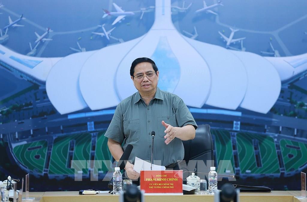 Thủ tướng Phạm Minh Chính làm việc với các nhà thầu, đơn vị thi công Dự án cảng hàng không quốc tế Long Thành. Ảnh: Dương Giang-TTXVN