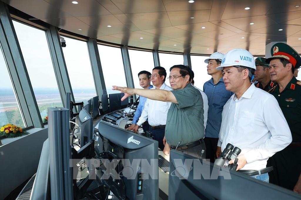 Thủ tướng Phạm Minh Chính kiểm tra, thị sát Dự án cảng hàng không quốc tế Long Thành từ Đài kiếm soát không lưu. Ảnh: Dương Giang-TTXVN