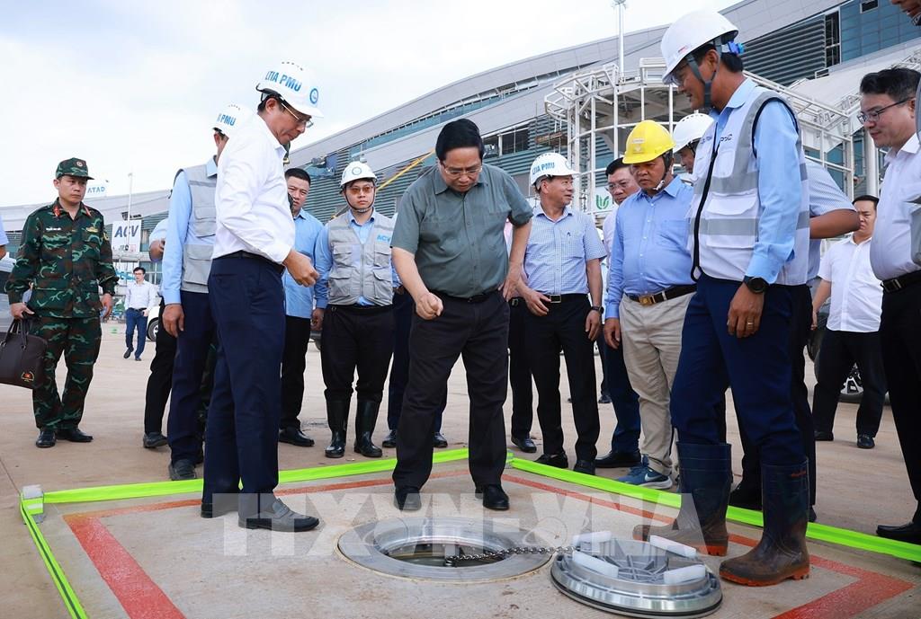 Kiểm tra, động viên các lực lượng đang thi công trên công trường, Thủ tướng Phạm Minh Chính biểu dương, cảm ơn các đơn vị, nhà thầu, đặc biệt là hơn 15.000 chuyên gia, kỹ sư, công nhân đang ngày đêm cùng 3.000 máy móc, thiết bị hối hả thi công, đẩy nhanh tiến độ để vận hành, đón chuyến bay đầu tiên vào ngày 19/12 và đưa Cảng hàng không quốc tế Long Thành vào khai thác thương mại vào nửa đầu năm 2026.