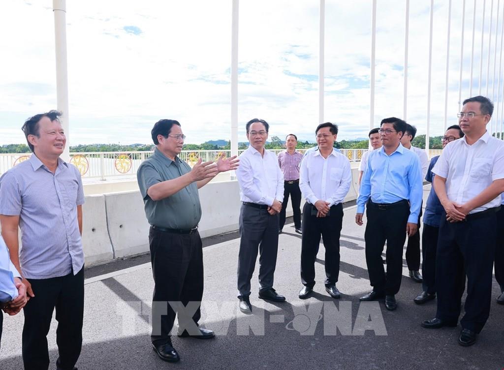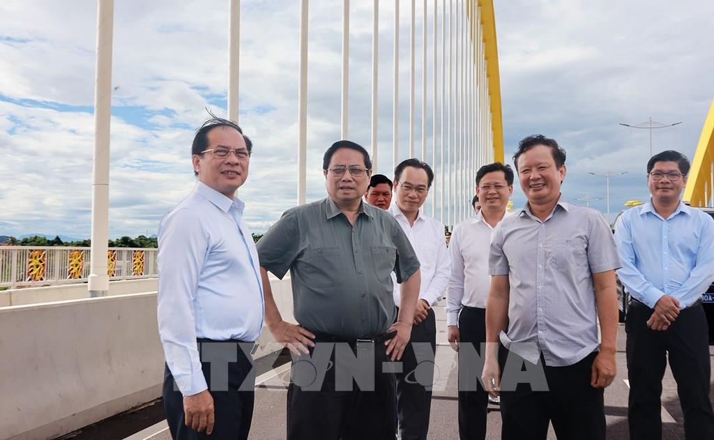 Thủ tướng Phạm Minh Chính thị sát cầu Nguyễn Hoàng bắc qua sông Hương. Ảnh: Dương Giang-TTXVN