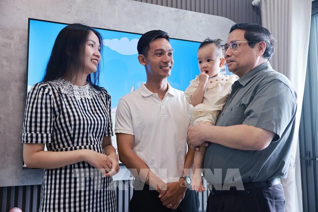 Thủ tướng Phạm Minh Chính thăm hộ gia đình đang thụ hưởng chính sách nhà ở xã hội tại thành phố Huế. Ảnh: Dương Giang-TTXVN