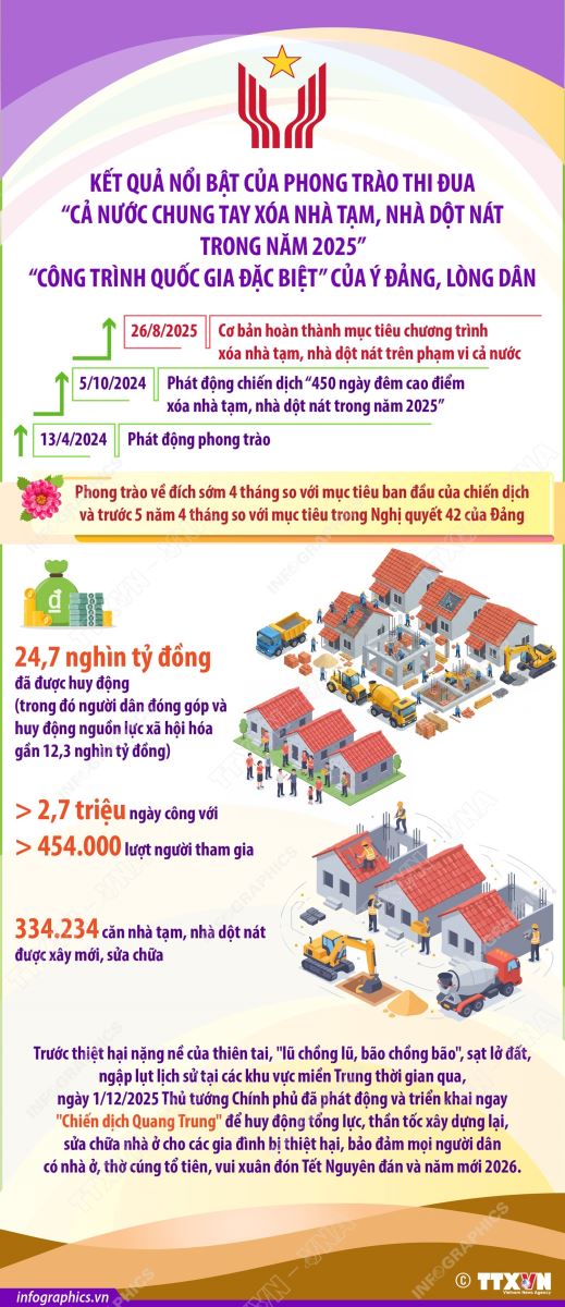 Hoàn thành cơ bản mục tiêu xóa nhà tạm, nhà dột nát sớm hơn 5 năm 4 tháng, với trên 334 nghìn căn nhà. Trong năm 2025, cả nước đã hoàn thành trên 102,6 nghìn căn nhà ở xã hội, đạt 102% kế hoạch năm; Quỹ Nhà ở quốc gia được thành lập. Hỗ trợ khoảng 8,8 nghìn tỷ đồng từ nguồn dự phòng ngân sách trung ương năm 2025 và trên 42,1 nghìn tấn gạo cho các địa phương để khắc phục hậu quả thiên tai[9]. Xây dựng đồng loạt 100 trường liên cấp tiểu học và trung học cơ sở ở các xã biên giới, hoàn thành trước ngày khai giảng năm học mới 2026-2027. Theo Liên hợp quốc, chỉ số hạnh phúc của Việt Nam năm 2025 xếp thứ 46, tăng 37 bậc so với năm 2020.