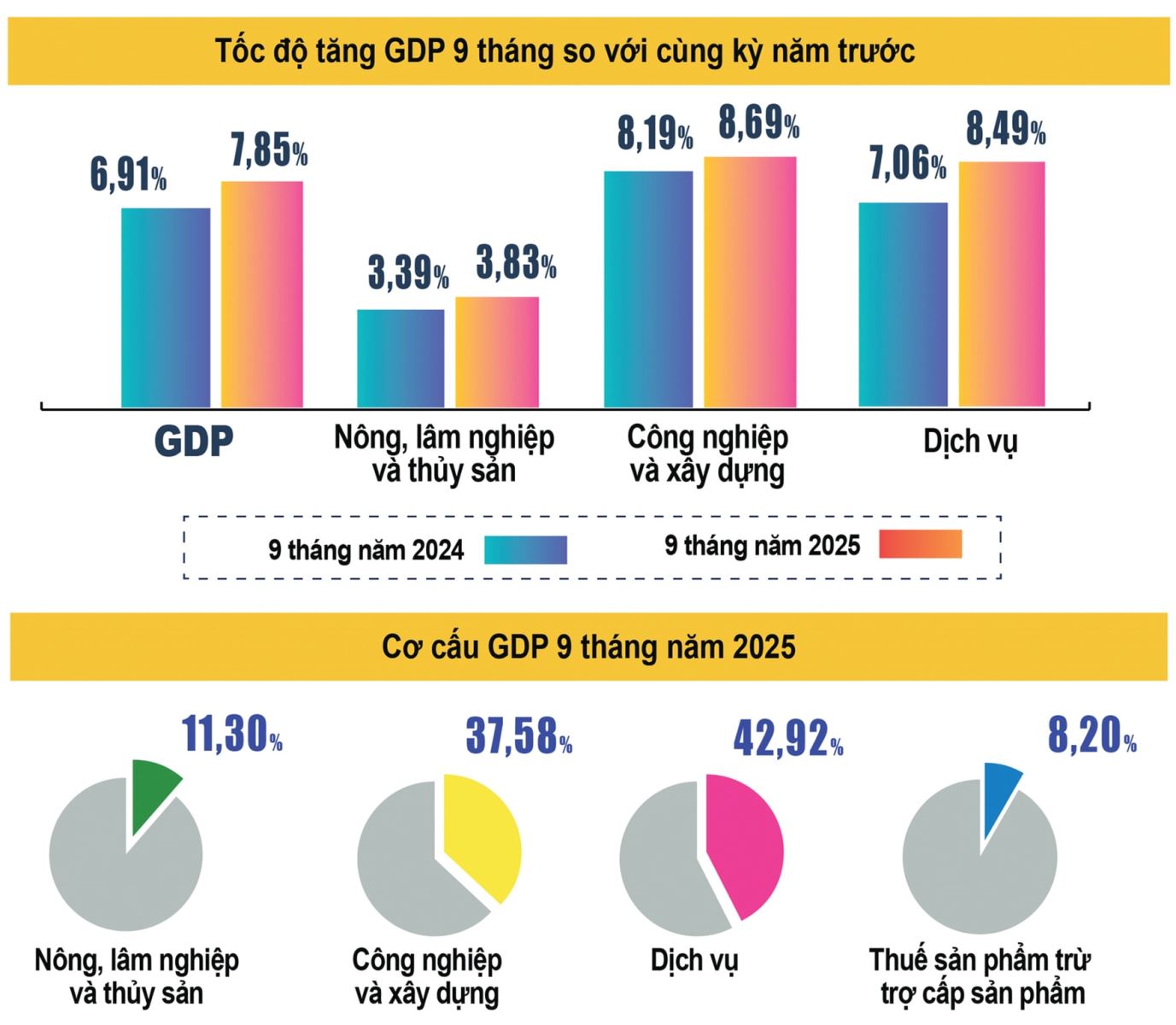 Động lực tăng trưởng này tăng gần 10%, góp phần cho tăng trưởng kim ngạch xuất khẩu từ phía cầu. Trong khi đó, khu vực 3 - dịch vụ có giá trị tăng thêm trong 9 tháng là 8,49%, chỉ thấp hơn mức tăng 11,37% của cùng kỳ năm 2022 trong giai đoạn 2011 - 2025. Các ngành dịch vụ có mức tăng trưởng cao như vận tải hàng hoá, dịch vụ lưu trú ăn uống, nghệ thuật và vui chơi giải trí.