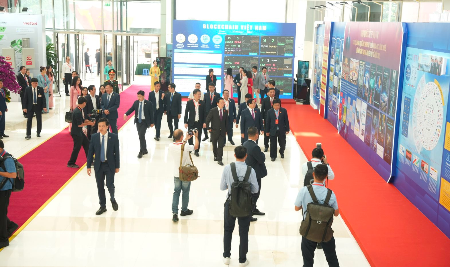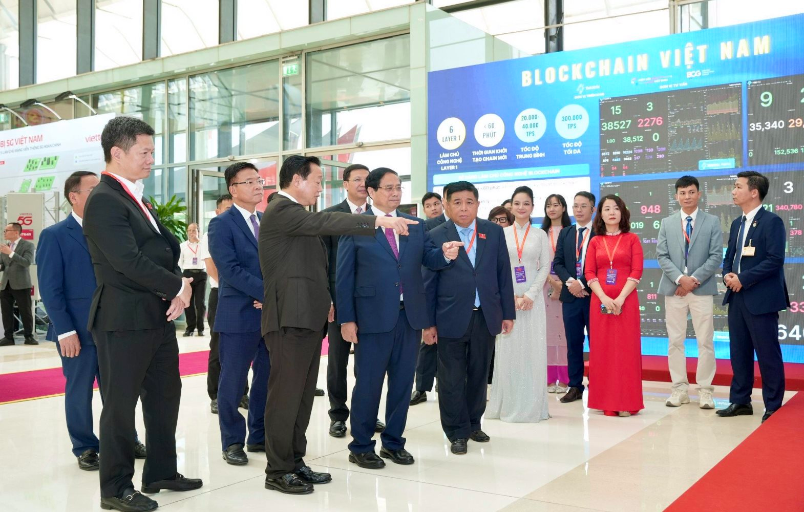 Thủ tướng Phạm Minh Chính và các quan chức Chính phủ thăm khu trưng bày Mạng Dịch vụ Đa chuỗi Blockchain Việt Nam (VBSN).