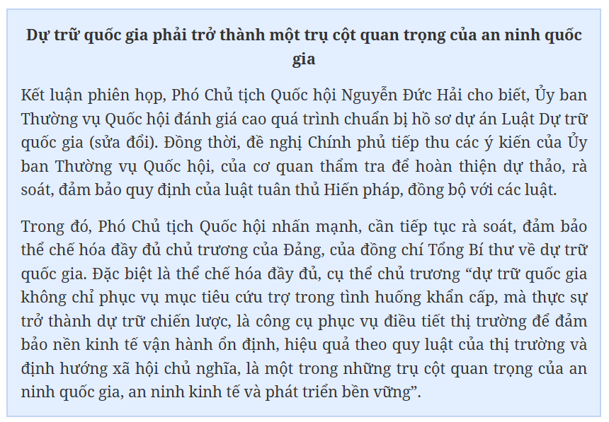 Bên cạnh đó, Thường trực Ủy ban Kinh tế và Tài chính đề nghị, cần nghiên cứu, bổ sung chính sách khuyến khích tổ chức, doanh nghiệp tham gia dự trữ chiến lược, như chính sách ưu đãi về thuế, tài chính, tín dụng, cơ chế mua lại và luân phiên hàng dự trữ chiến lược... Đồng thời, tiếp tục cụ thể hóa các nội dung, đặc biệt những vấn đề quan trọng như dự trữ chiến lược, xã hội hóa dự trữ quốc gia, điều tiết thị trường; cơ chế, chính sách đặc thù đối với đội ngũ cán bộ trực tiếp làm công tác dự trữ...